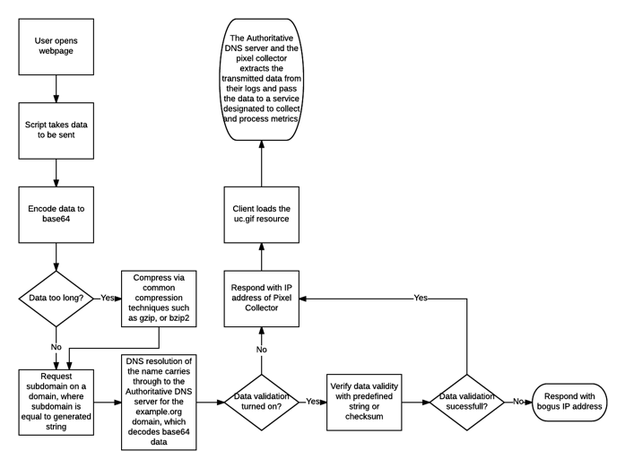 If the data string is too long, it may be compressed using common compression techniques such as gzip, or bzip2.The client would request http://cGFnZURhdGE9Zm9vYmFyO3VuaXFJRD11c2VySUQ7JUROU19DT0xMRUNUT1JfVjEl.example.org/. However should the data be compressed the client would request http://cGFnZURhdGE9Zm9vYmFyO3VuaXFJRD11c2VySUQ7JUROU19DT0xMRUNUT1JfVjEl.compressed.example.org/.